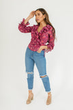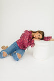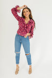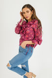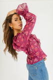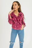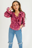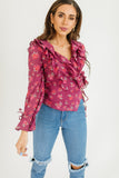 - magenta floral // v-neckline, ruffle detail, true wrap, long sleeves, tie detail