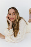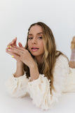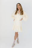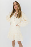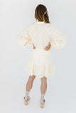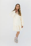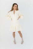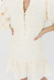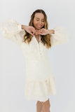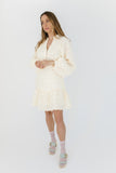 - ivory // knee length, feather texture, v-neckline, working buttons, ruffle hem, fully lined