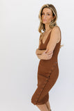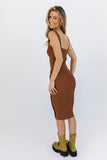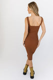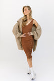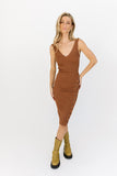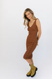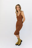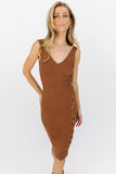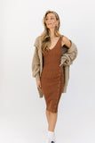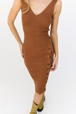- chocolate // v-neckline, knee length, side buttons, ribbed