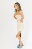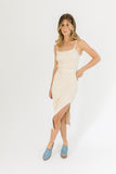 - sand // midi length, adjustable spaghetti straps, side slit, working belt