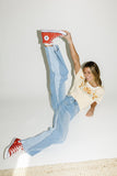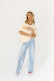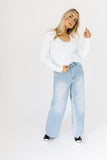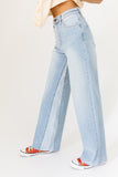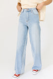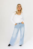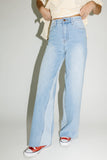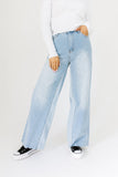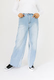 - light wash // wide leg, one button zip fly, pockets, belt loops, seam detailing, two tone wash, raw hem