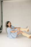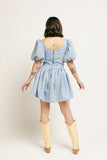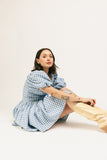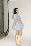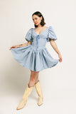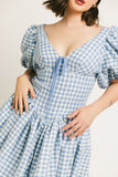 a sweet dress with a sultry twist, this plaid puff sleeve mini is ready for anything. it has a drop waist silhouette with a flirty v-neckline + a dainty tie detail. featuring shiny thread throughout, it’s the perfect little blue party dress for all those things you’ve got planned.