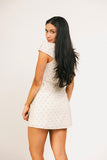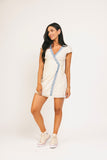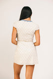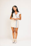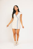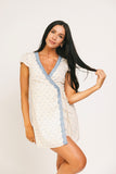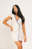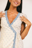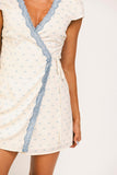 • cream // mini length, v-neckline, true wrap, lined, lace trim detailing
