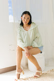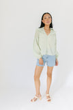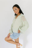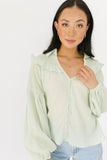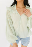 • tea green // collared, working buttons, balloon sleeves, sheer fishnet across shoulder