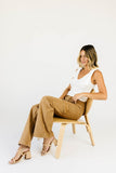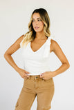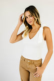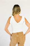 take any summer outfit to girly new levels with this not-so-basic white tank. featuring a sleek v-neckline + exaggerated bow tie straps, it’s a staple piece that still makes a statement. we love it paired with a maxi skirt + heels for date nights, or denim shorts + flats for casual outings.