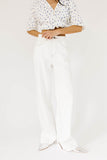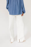 - egg white // wide leg, one button fly zip, pockets, belt loops, brown seam detailing