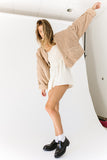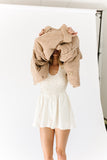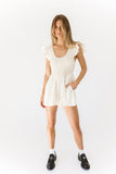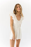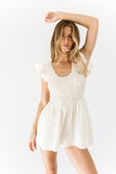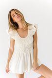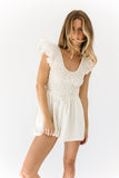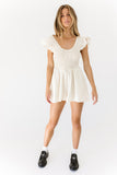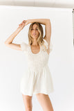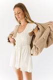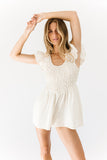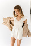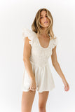 - beige // scoop neckline front + back, ruffle sleeves, smocked bodice, elastic waist, pockets