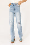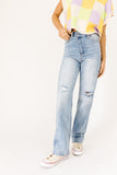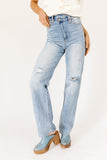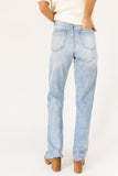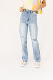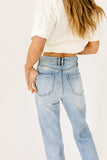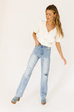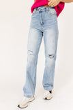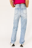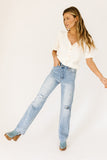 - light wash // cross over, straight leg, one button zip fly, pockets, belt loops, distressing at knee