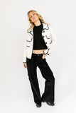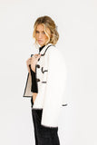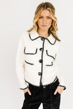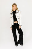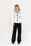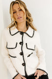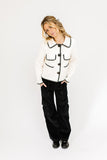 - white + black // collared, pockets, buttons, embroidered hem detailing, sparkle fabric, lined