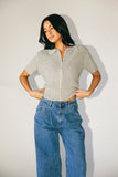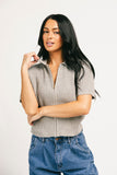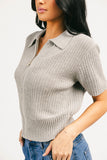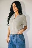 luxurious but still lightweight, this short sleeve knit top is the ideal seasonal transition piece. it has a relaxed, slouchy fit with a chic collar detail. the perfect zip-up top to pair with a skirt + heels for work, or jeans + sneakers for casual outings.