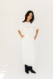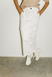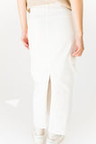 - white // maxi length, one button zip fly, belt loops, pockets, large back slit