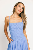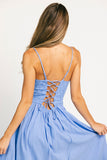 - blue // midi length, square neckline, adjustable spaghetti straps, eyelet bodice, v-waist, side zipper closure, elastic back waist, lace up back, pockets, lined throughout