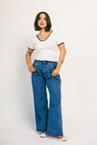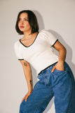 - white // scoop neck, puff sleeves, ribbing at waist, neckline, and cuffs, black trim detailing at neckline, hem, and cuffs