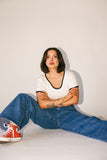 this not-so-basic white scoop neck top is luxuriously soft + fits like a dream. featuring black trim details + a ribbed waistline that snatches just right, it’s guaranteed to make you look effortlessly chic. dress it up with a mini skirt + heels for date night, or down with jeans + sneakers for casual outings.