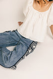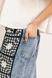 - light wash // high waisted, one button fly zip, working pockets, belt loops, wide leg, navy + white crochet sides