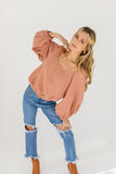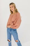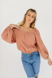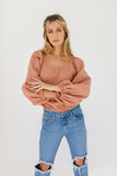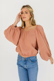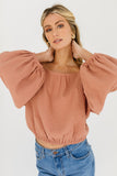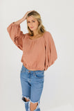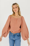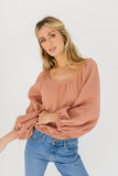- faded coral // scoop neckline, long bubble sleeves, elastic hem, keyhole button closure