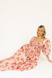 - pink watercolor // midi length, scoop neckline, dramatic puff sleeves, back zipper closure, smocked bodice, fully lined