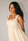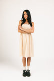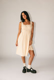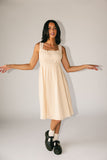 - butter // knee length, square neckline, lined throughout, ruched bodice, elastic neckline, bust and waist