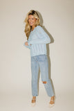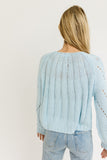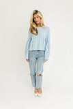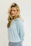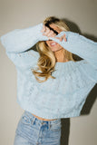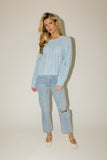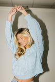 soft + sweet, this slouchy light blue sweater will be your new go-to for any spring outfit. featuring cable knit stitching + eyelet details, it’s lightweight + perfect for layering. dress it up with skirts + ballet flats, or down with jeans + sneakers.