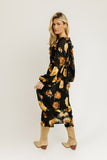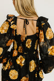 a long sleeve midi dress like no other, this on-trend piece features ruffle details, a stretchy smocked back, + a chic modern-realism floral pattern. the perfect spring dress for weddings, date nights, + everything in between.