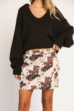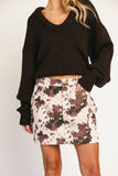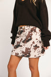 add a trendy touch to any outfit with this retro-inspired cow print mini skirt. the perfect piece for every season, you can style it with cowboy boots for concerts + rodeos, or chunky sneakers for date nights + casual hangs.