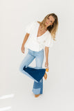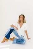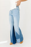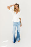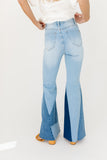 - light wash // flare pant, raw hem, patchwork detailing, zip fly, pockets