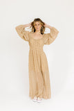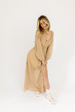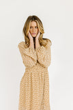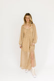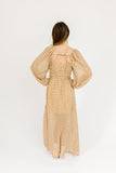 - taupe floral // maxi length, square neckline, sheer balloon sleeves, elastic band in back, elastic waist, side slit, lined to knee