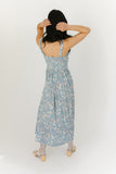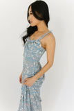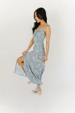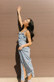 - slate blue // maxi length, elastic straps, smocked back, front slit, faux buttons