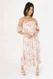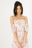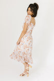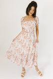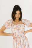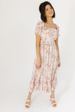- multicolor floral // midi length, square neckline, adjustable tank straps, puff sleeves, elastic waist, partially lined, ruffle hem