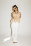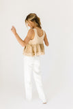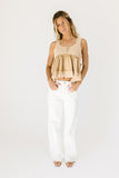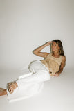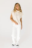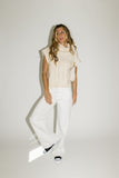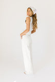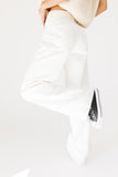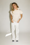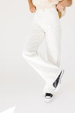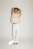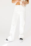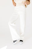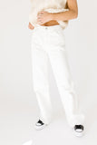 - white // wide leg, one button zip fly, pockets, belt loops, raw hem