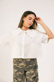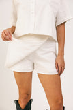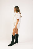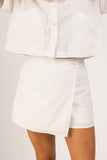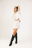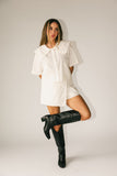 - off white // scoop neckline, peter pan collar with ruffle hem, buttons, pockets, slightly cropped, boxy fit, mini length skort, faux button at waist, faux back pockets, side zipper closure