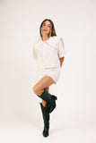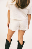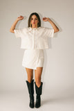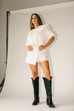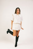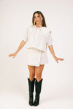 a vintage-inspired blouse + mini skort set with endless styling possibilities. it features a breezy + boxy collared top + a coordinating skort. worn together or styled solo, this elevated set is cute, comfy, + ready for all your shenanigans.