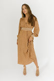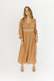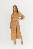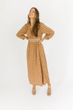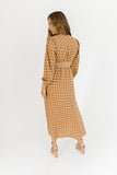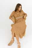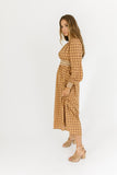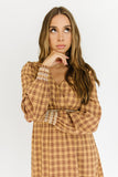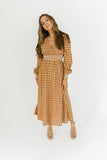 - caramel + brown plaid // midi length, v-neckline, smocked waist