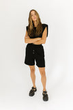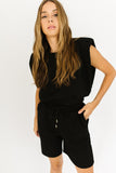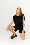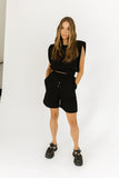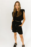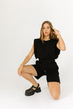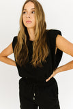 - black // two-piece set, crew neckline, shoulder pads, rolled sleeves, elastic waist, adjustable tie, working pockets