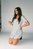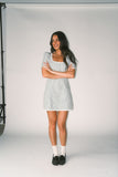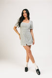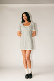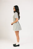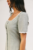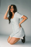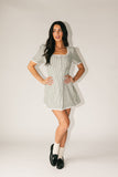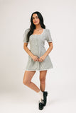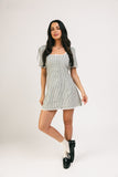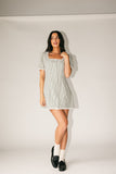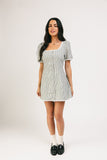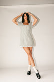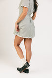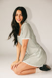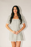a retro-inspired mini dress with a jaw-dropping silhouette, it features muted green pinstripes + wavy eyelet lace trim. guaranteed to get endless compliments, it’s the perfect button-up mini dress for brunch dates, girls nights, + everything in between.