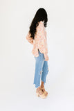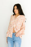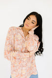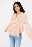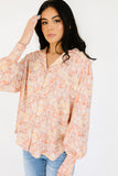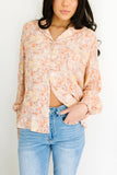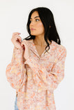 - peach // collared, buttons, balloon sleeve, elastic cuff, floral print