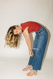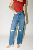 - medium wash // wide leg, high waisted, one button zip fly, pockets, belt loops, distressing throughout, raw hem