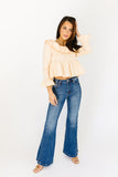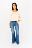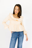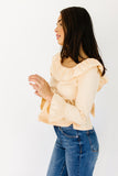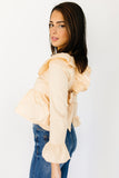 - faded peach // scoop neckline, ruffle detailing, peplum style, open back, back ties