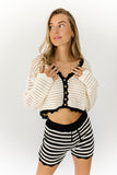 - cream + black // two piece set, v-neckline, buttons, cropped, eyelet detailing, elastic waistband, adjustable drawstring, lined shorts, scallop hem