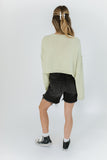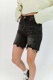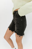 - faded black // mid length, zipper fly, pockets, distressed hem