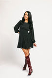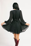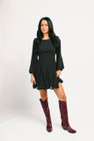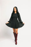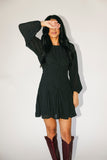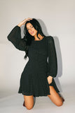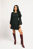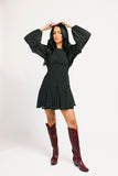 - black // mini length, scoop neckline, sheer balloon sleeves, elastic cuffs, smocked back waist, back tie, keyhole w/ button closure, lined, pleated skirt