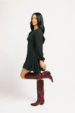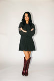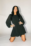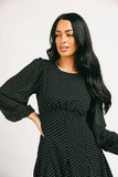 this flirty polka dot mini dress will make everyone stop + stare (+ then ask you where you got it from). it features a sleek corset-style bodice with a high neckline + long balloon sleeves. the perfect little black mini dress for date nights, fancy dinners, + posh parties.