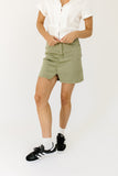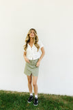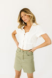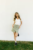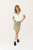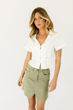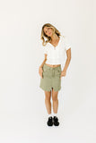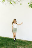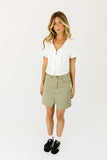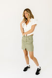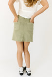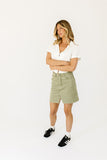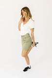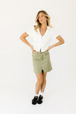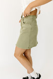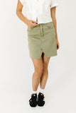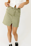 - olive // mini length, high waisted, one button zip fly, belt loops, pockets, small front slit