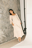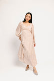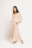 - vintage cream // maxi length, sweetheart neckline, balloon sleeves, elastic cuffs, smocked back waist, tie back closure, lined to thigh, ruffle detailing at neckline + bust