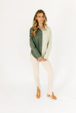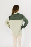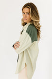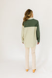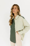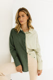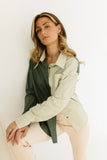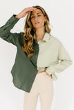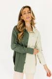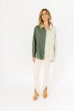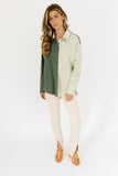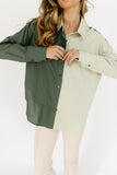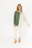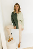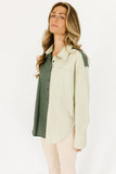 - olive + sage // collared, breast pocket, buttons, cuffed sleeves, color block