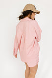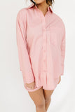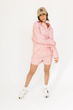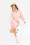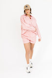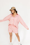 - pink // two piece set, collared, buttons, breast pocket, elastic waistband, pockets