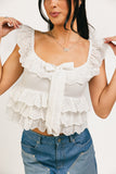 the perfect combination of flirty + feminine, this tiered off-white tank will take any outfit to the next level. featuring fluttery eyelet ruffles + a dainty bow detail, it’s a must-have for spring + summer. dress it up with a mini skirt + kitten heels, or down with shorts + flats.