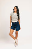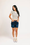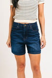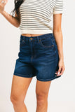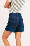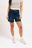 your new ride-or-die bottoms, these dark wash denim shorts are what summer dreams are made of. they have a vintage-inspired wash with subtle fading for that luxe, lived-in look. the perfect mid-length shorts to dress up or down all season long.