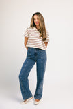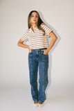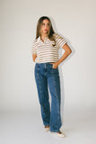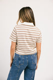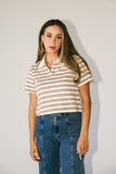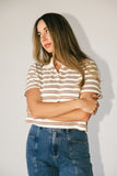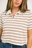 the elevated tee of our dreams, this brown striped collared top has the most perfect boxy, cropped silhouette. full of cute casual outfit opportunities, dress it up with trousers + flats, or down with jeans + sneakers.