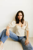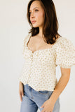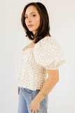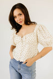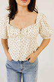 - cream brown floral // sweetheart neckline, cropped, buttons, side zipper closure, puff sleeves, elastic shoulders, elastic cuffs, lined chest